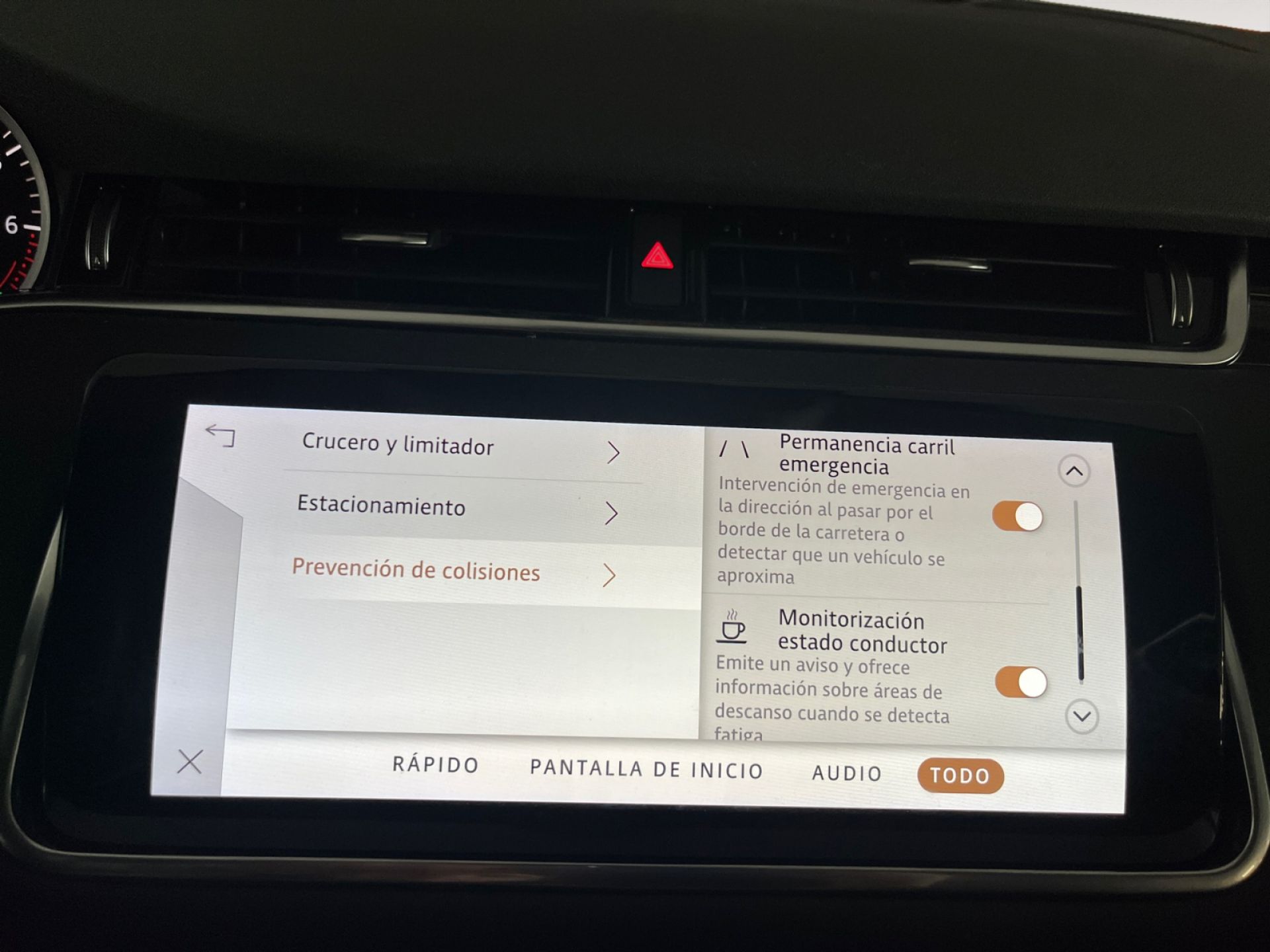 - Sistema de alarma de colisión: activa las luces de freno con asistencia de frenado, sistema antiatropello peatones/ciclistas, monitorización del conductor y frenado a baja velocidad de 5 Km/h como mínimo aviso visual/ acústico, funciona por encima de 50 km/h / 30 mph y funciona por debajo de 50 km/h / 30 mph